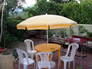 Во дворе для отдыха под зонтами стоят столы, стулья.