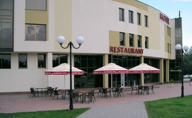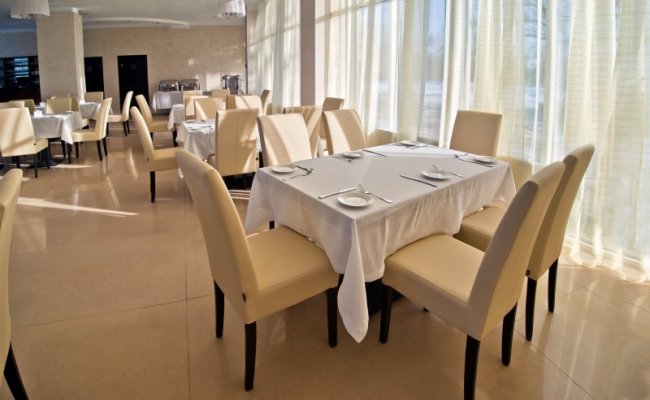 Ресторан расположен на первом этаже отеля и имеет отдельный вход. В теплое время года летная площадка перед отелем, а также оборудованная зона отдыха с бассейном на территории отеля.