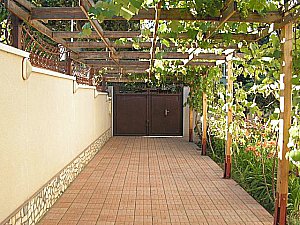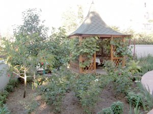 Детская качеля. Ухоженный двор, уютная обстановка.