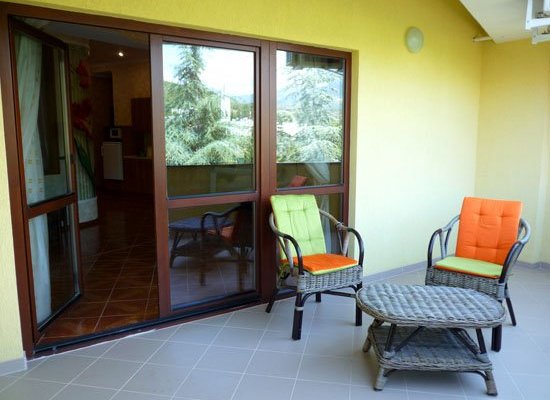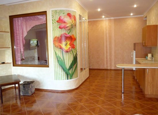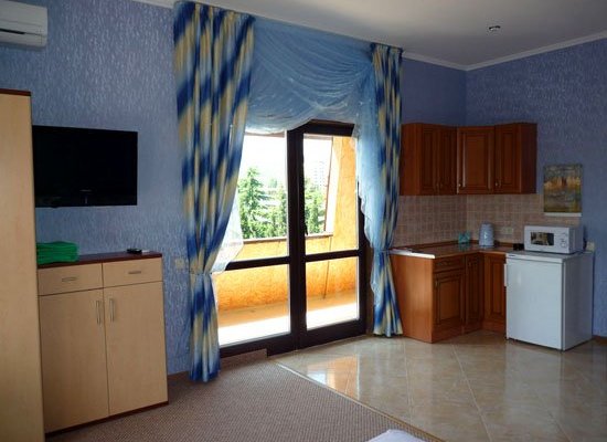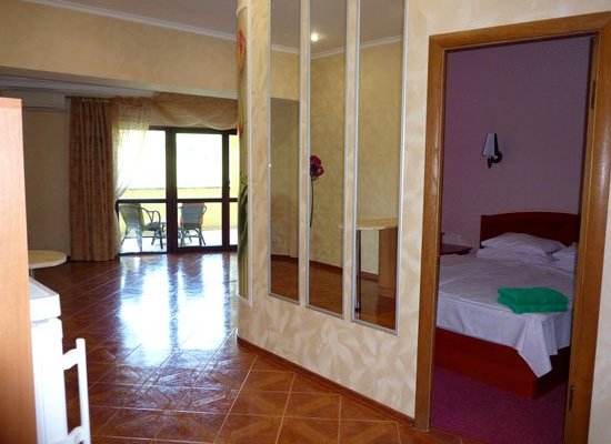 Апартаменты "Люкс" – двухкомнатный номер с видом на гору Демерджи, двуспальная кровать, раскладной 1 диван, мягкое ковровое покрытие в спальне, в гостиной кафель, шкаф, телевизор, холодильник, кондиционер, кухонный уголок, кухонная посуда, чайник, микроволновая печь, ванная комната с душевой кабинкой, биде, комплект банных полотенец, сушилка для белья, просторный балкон.