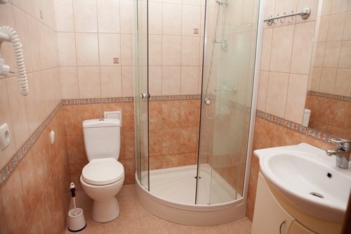 Санузел оборудован современной душевой кабиной, умывальником и унитазом.