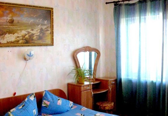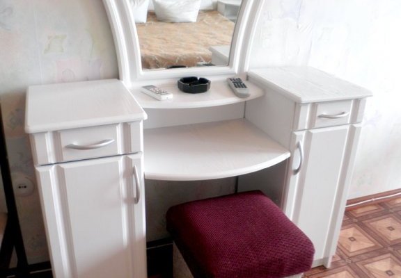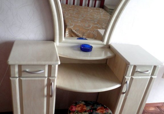 - новой мебелью: деревянные кровати, прикроватные тумбочки, трюмо с пуфиком для женщин, вместительный шкаф, мягкие стулья; сервант с набором посуды;