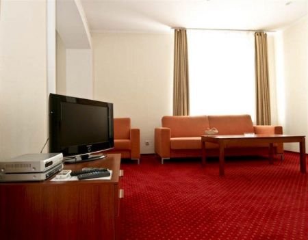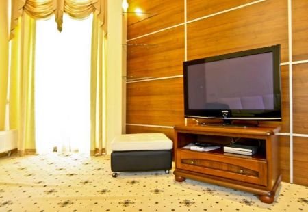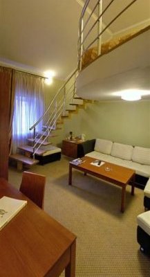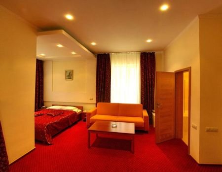 Элитный номер с двумя комнатами общей площадью 54 кв.м. Роскошные апартаменты, в которых любят останавливаться бизнесмены, звезды шоу-бизнеса и молодожены. В номере есть гостиная, спальня и ванная комната, оборудованная джакузи и сауной. Также номер оборудован кожаным диваном, двумя плазменными панелями, двуспальной кроватью, телефоном, кондиционером, мини-баром, электронным сейфом, ванной с подогревом пола (предоставляются все гигиенические принадлежности французского производства). Возможен вариант с балконом. Большая терраса выходит на Успенскую улицу.