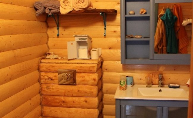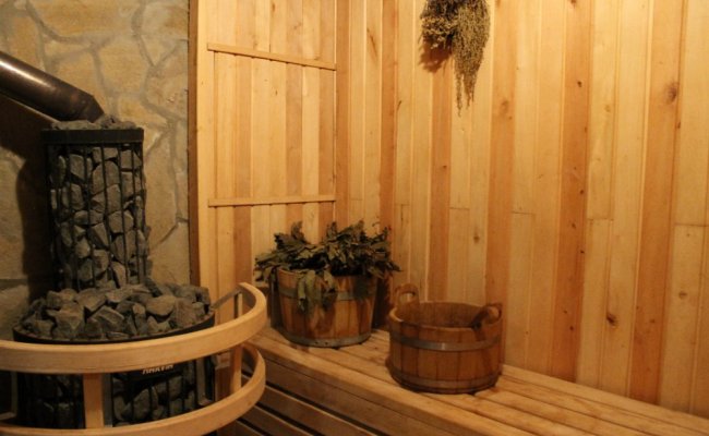 Баня расположена в 300-х метрах от домика. На первом этаже каминный зал, терраса с выходом на пирс, сауна с огромной душевой и санузел. На втором этаже расположены две спальни с двух-спальными кроватями и санузлами. Рядом находится мангал.