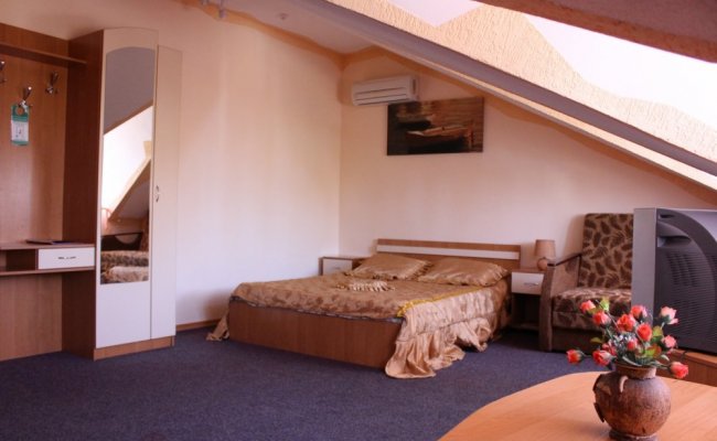 3. Номера "Люкс", двухкомнатные. В одной комнате спутниковое TV, холодильник, телефон, сан узел, душ, 2-х спальная кровать, раскладной диван. В другой комнате спутниковое TV, холодильник, раскладной диван. Выходы из комнат могут быть раздельными. Эти номера рассчитаны как семейные на 4-6 человек.