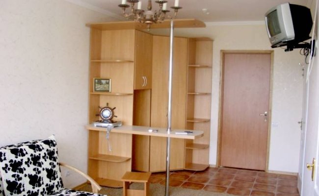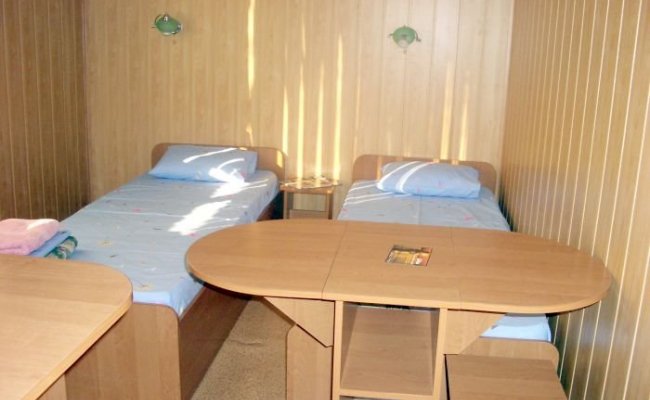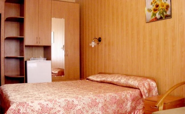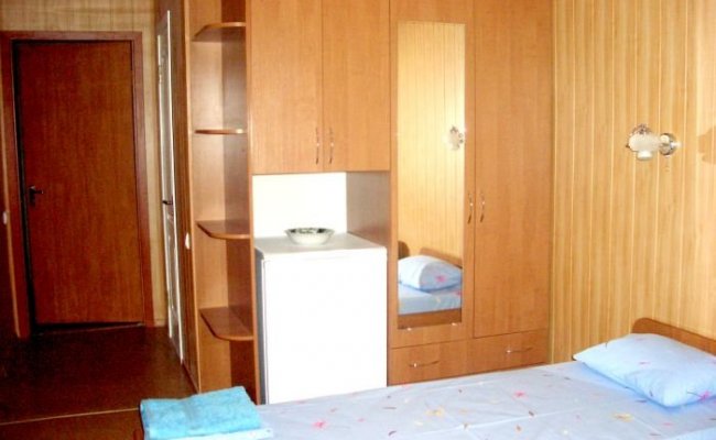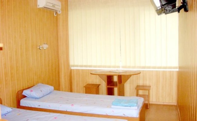 Комплектация номера: две кровати односпальные, выдвижная дополнительная кровать, платяной шкаф, стол, табуреты, холодильник, телевизор (10 спутниковых каналов), кондиционер.