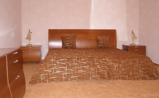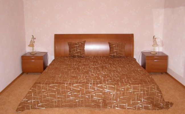 Спальня: двуспальная кровать, прикроватные тумбочки с настольными лампами, ковровое покрытие (ковролин).