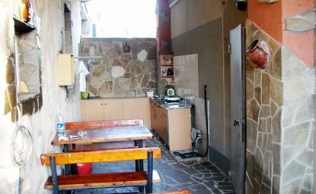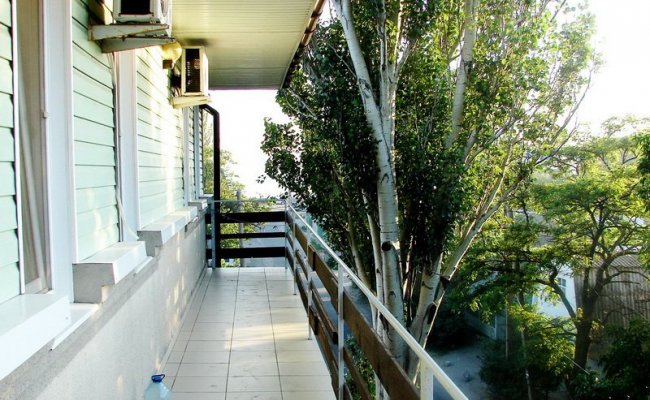Территория гостиницы «Аист» (г. Бердянск) под видео наблюдением, кухня со всем необходимым для приготовления пищи, зелень и цветы, столики для отдыха, мангал. На 1-м этаже расположен продуктовый магазин. Стоянка для авто.