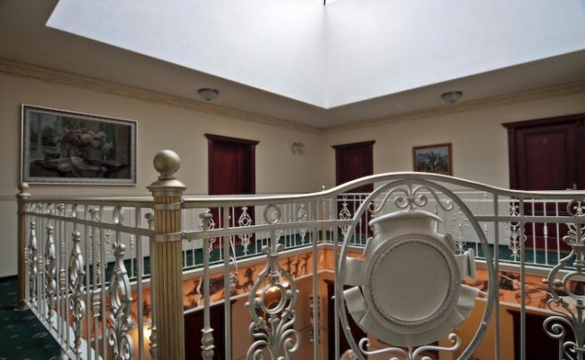 На первом этаже отеля расположен ресторан "Черчилль" и кафе-кондитерская "Бизе", банк.