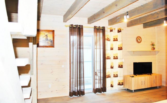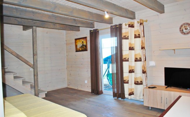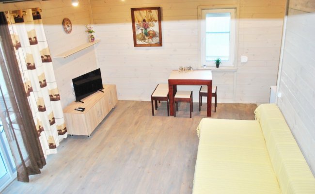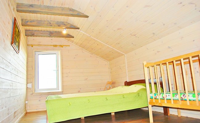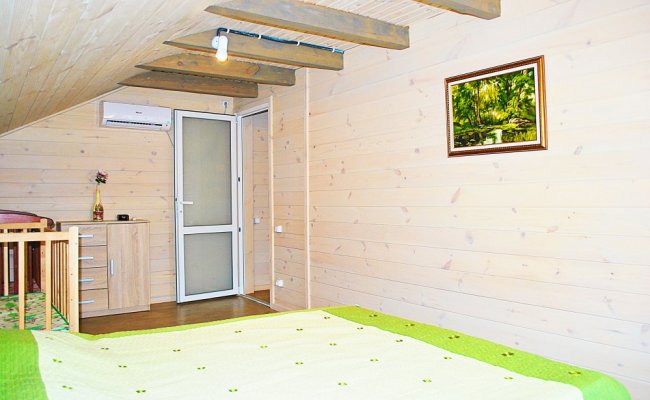 4 комфортабельных деревянных двухэтажных дома. Общий заезд и стоянка для машин, отдельный вход в калитку и отдельный участок у каждого дома. На участке. Дом, терасса с садовой мебелью, стол со стульями, большая садовая качеля, гамак, шезлонг, озеленение (березки, хвоя). На первом этаже холл-гостинная с раскладным диваном, санузел, бойлер, кухня, кондиционер, лестница на второй этаж. На втором этаже две спальни. Из каждой спальни вид на море. В спальнях раскладные диваны. Для самых маленьких гостей по запросу можем предоставить детскую кроватку, манеж, кресло-столик для кормления и т.д. Всего в доме 6 спальных мест 2+2+2.
