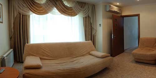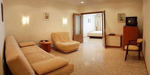 -два 2х комнатных номера (40м.кв.), в номере холодильник, кондиционер, тв., электрочайник, удобная мебель, санузел(туалет,умывальник,душевая кабина), номер расчитан на 3-4 человека.