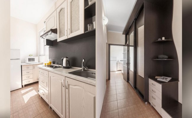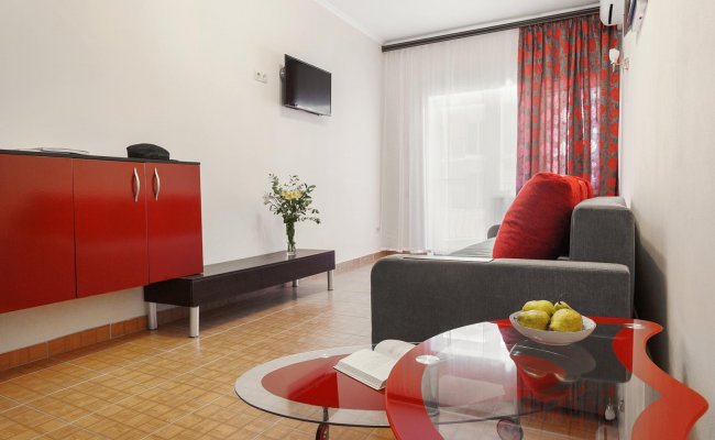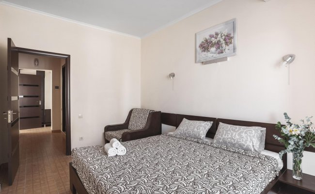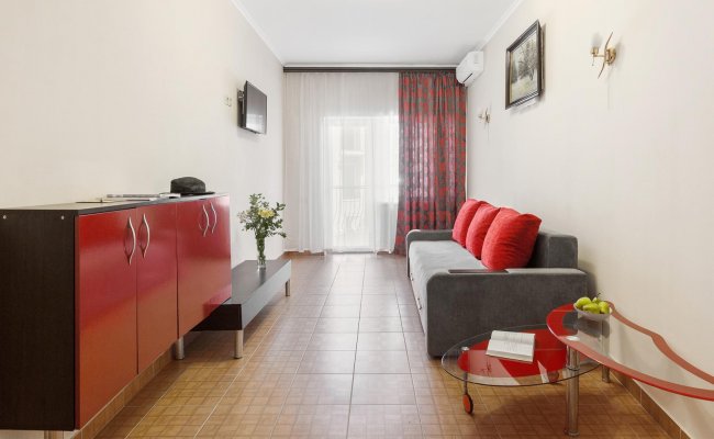 Семейные апартаменты класса "Люкс". Номер состоит из двух спальных комнат, прихожей и кухни в которых может разместиться до 6 человек. Комнаты оборудованы: двуспальной кроватью, раскладным диваном, креслом-кроватью, тумбочками, комодами, шкафами, телевизором. В прихожей расположены вешалка, шкаф и выход в санузел с душевой кабиной, туалетом, набором полотенец и ванной мебелью. Кухня оборудована кухонной стенкой, холодильником, электропечкой и посудой. С балкона открывается вид на море, есть плетеная мебель.