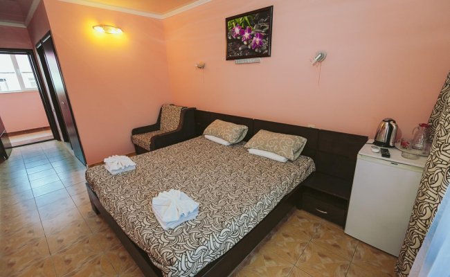 Номера класса "Полулюкс". В номерах может разместиться 2-3 человека. Площадь номера: 17 кв. м.. Комната оборудована: деревянной мебелью (двуспальная кресло-кровать, односпальная кровати, тумбочки, шкаф, вешалка), техникой (телевизор, кондиционер, холодильник, электрочайник). На балконе есть плетеная мебель.