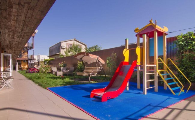 Для детей на территории отеля устроен большой зеленый двор с ухоженным газоном на котором расположены: горка, песочница, качели и сказочные скульптуры.