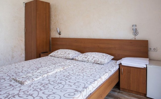 Кроме традиционной двухспальной кровати, номера меблированы шкафом и прикроватными тумбочками.