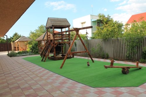 Облагороженный,зеленый двор( мангал, беседка, детский комплекс), расположенные в тихом местечке недалеко от моря, песчаный пляж,мелкое море, чистый.