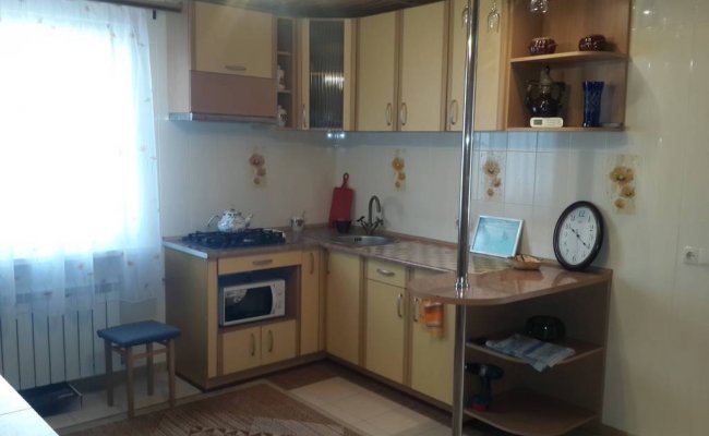 - Первый этаж: кухня (в наличии все необходимое для приготовления еды: посуда, печка, кастрюли, сковородки, микроволновка, электрочайник, холодильник), спальня (двуспальная кровать, шкаф, телевизор, кондиционер), санитарный узел с круглосуточной горячей водой.
