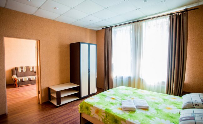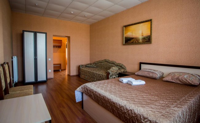 - Люкс. Состоит из гостиной, спальни и санузла. В номере: диван-кровать, двуспальная кровать, кондиционер, мягкий уголок, шкаф, тумбочки, санузел, телевизор, холодильник, Wi-Fi.