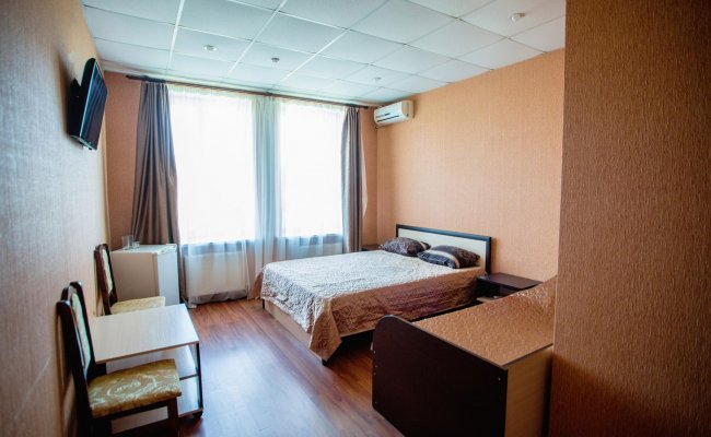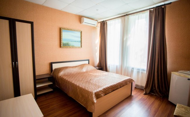 - Стандарт. В номере: двуспальная кровать, кондиционер, гардероб, тумбочки, телевизор, санузел, холодильник, тумбочки, Wi-Fi.