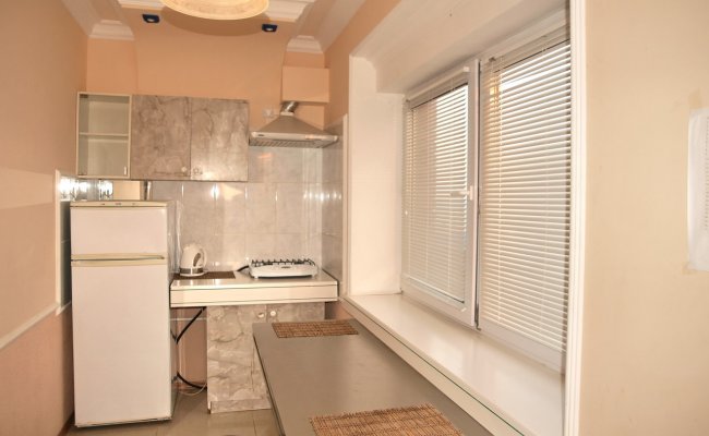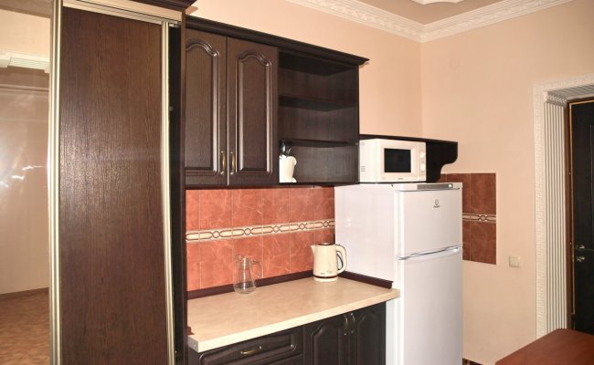 - Люкс студия 2-х местный. В номере: спальня (двуспальная или две односпальных кровати, тумбочки, шкаф, телевизор), кухонная зона (холодильник, микроволновка, электрочайник, комплект посуды мойка), полноценный санузел с горячей водой, балкон.