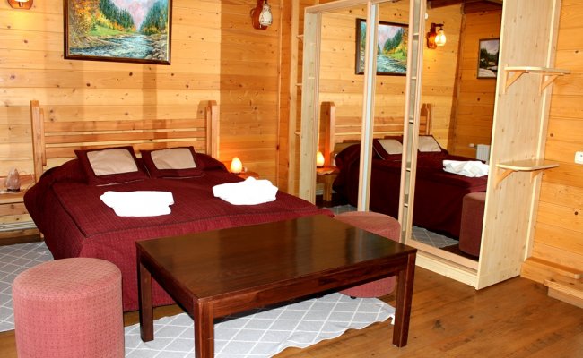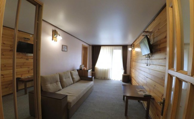- Полулюкс семейный с камином, который предназначен для небольшой семьи и расположен на первом этаже. В номере предусмотрена двуспальная кровать, раскладной диван, телевизор, холодильник, камин и санузел.