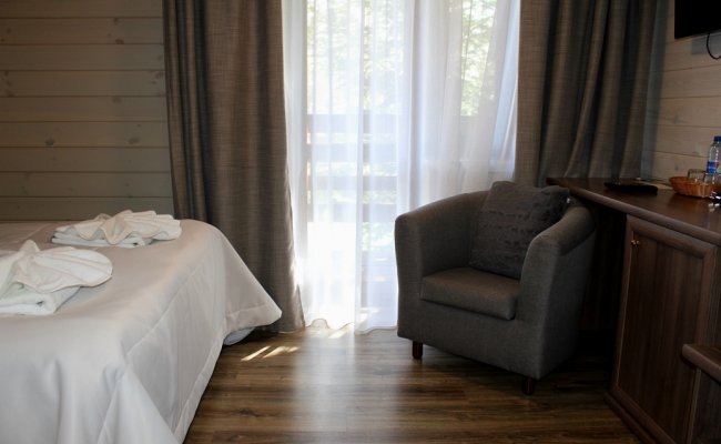 - Стандартный двухместный номер с 1 кроватью. В номере присутствует кровать и раскладное кресло, телевизор, санузел и балкон, вид которого выходит на озеро.