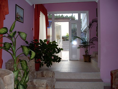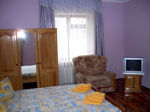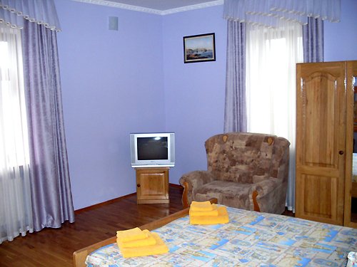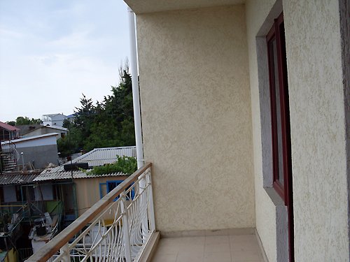 В номере: деревянная мебель, изготовленная по специальному заказу, большая двуспальная кровать, два раздвижных кресла, дубовый паркет. В номере есть мини-кухня, с посудой, электрическим чайником и мини-баром. В номере огромный балкон – площадью 9 м2, отсюда открывается прекрасный вид на море и горы – вся Алушта, как на ладони. (Балкон (вид на море и горы); горячая вода (круглосуточно); душ; туалет+умывальник; кондиционер; спутниковое ТВ (54 канала); холодильник; телефон; кухня; эл. чайник; посуда - частота уборки (каждый день), смена постельного белья (по желанию).
