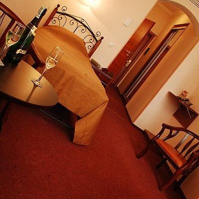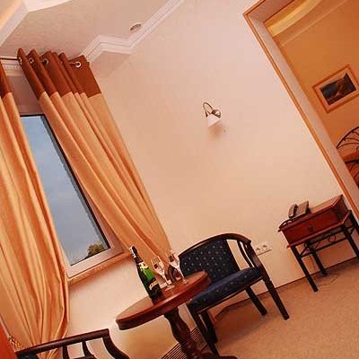 В одной комнате есть зеркальный шкаф-купе, двухместная кровать с ортопедическим матрацем. 2 прикроватные тумбочки, раскладывающийся кожаный диван, кожаное кресло, журнальный столик, телевизор (51 канал), мини-бар, сейф, телефон, доступ в Интернет.