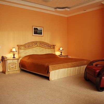 В таком номере есть зеркальный шкаф-купе, двухместная кровать с ортопедическим матрацем, 2 прикроватные тумбочки, раскладывающийся кожаный диван, кожаное кресло, журнальный столик, телевизор (51 канал), мини-бар, сейф, телефон, доступ в Интернет.