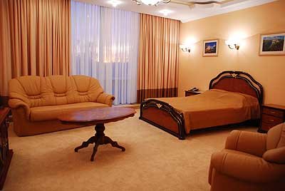 В таком номере есть зеркальный шкаф-купе, двухместная кровать с ортопедическим матрацем. 2 прикроватные тумбочки, комод, туалетный столик с зеркалом, раскладывающийся кожаный диван, журнальный столик, телевизор (51 канал), мини-бар, сейф, телефон, доступ в Интернет.
