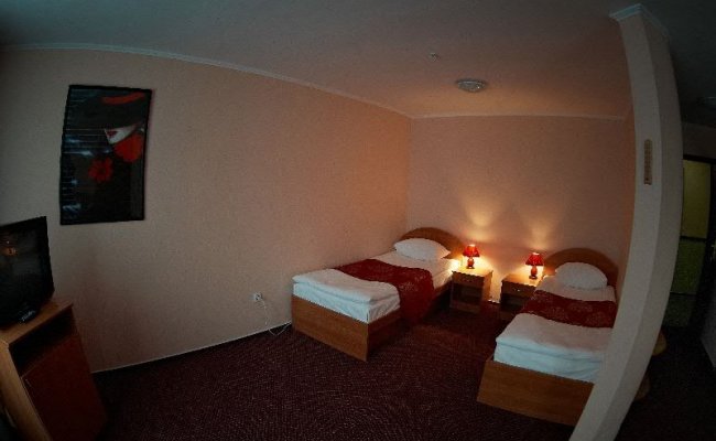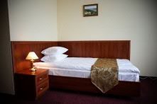 Это однокомнатный номер с двумя раздельными кроватями, телевизором, небольшим письменным столиком. Ванная комната – душевая кабина и все необходимые душевые принадлежности в двух экземплярах. В цену номера входит завтрак «шведский стол» и минеральная вода.