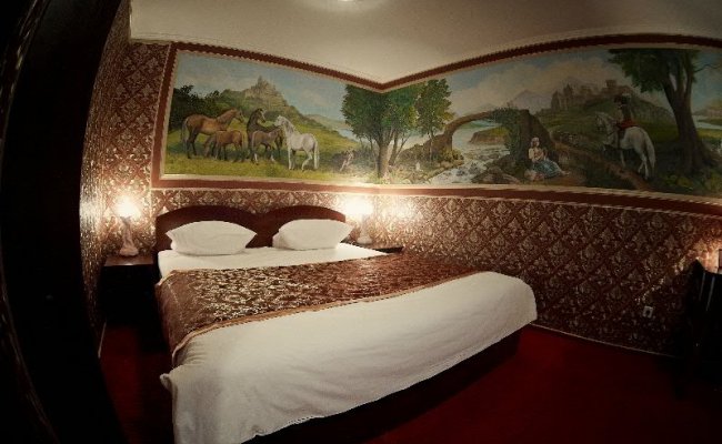 Полуторная комната с двухспальной кроватью, прикроватными тумбочками с настольными абажурчиками, телевизором, холодильником, диванчиком для отдыха. Спальное место отделяется от зоны отдыха полукруглой стеной. Ванная комната – душевая кабина и все необходимые душевые принадлежности в двух экземплярах. В цену номера входит завтрак «шведский стол» и минеральная вода.