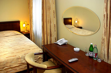1-ком., двуспальная кровать, две тумбочки, LCD телевизор, шкаф, письменный стол, кресло, мини-бар, душ, гостиничные аксессуары.