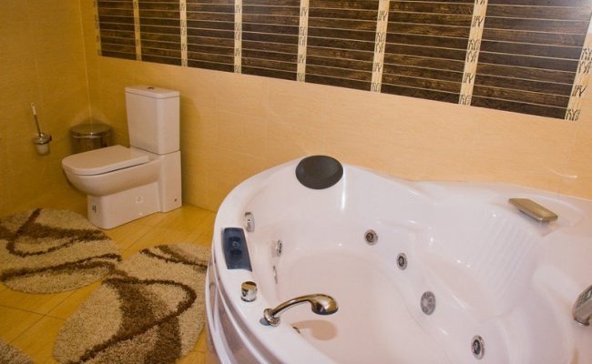 Ванная комната с джакузи. В ванной - гигиенические средства (мыло, шампунь, набор для чистки зубов, набор для бритья, косметический набор, набор для шитья), тапочки, халаты, полотенца для рук, лица и ног, фен .