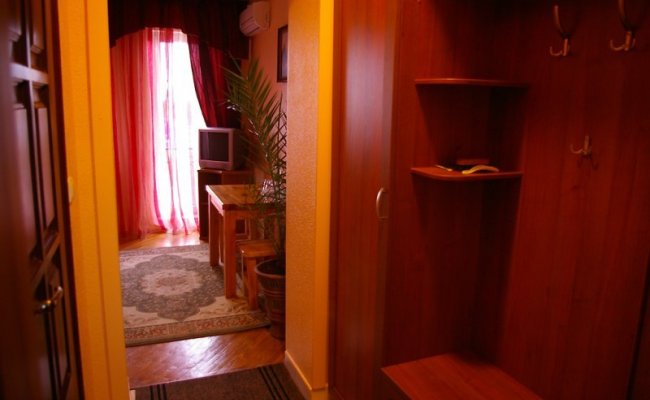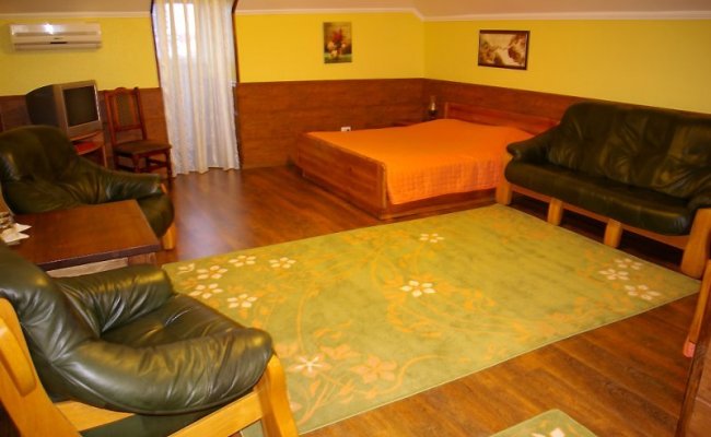 - Полулюкс. Одно- двухкомнатный номер, одна двуспальная кровать, мягкий уголок, телевизор, кондиционер, телефон, холодильник с мини-баром.