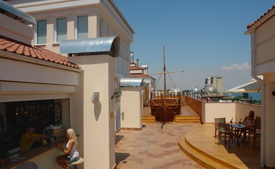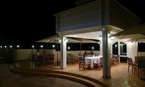 Открытая веранда на крыше отеля "Алые паруса" - естественный солярий с прекрасным видом на Феодосийский залив, по вечерам здесь открыт бар.