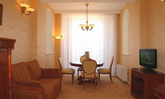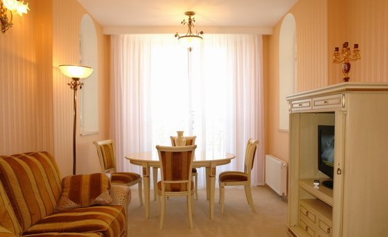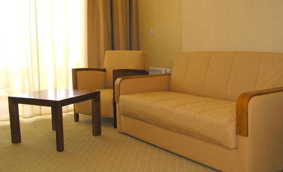 В номере две комнаты: уютная спальная комната и просторная гостиная с мягкой мебелью.