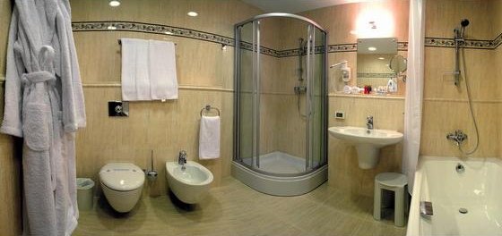 А также просторная туалетная комната с душевой кабиной и ванной.