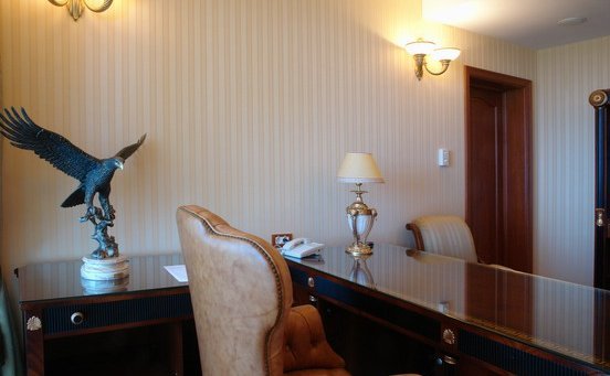 Один из номеров сьют мы обустроили для людей, которые во время отдыха не могут забыть о работе. В нем есть спальная комната, гостиная и удобный кабинет в строгом классическом стиле.