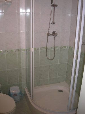 Санузел совместный, полной комплектации: душевая кабина, унитаз, раковина. Горячая и холодная вода круглосуточно.