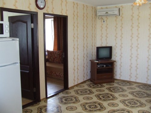 Отдыхающий получает: 1,2-комнатный оригинальный номер с террасой. Просторная прихожая, кухня и спальни оборудованы комфортабельной мебелью, телевизором (спутниковое телевидение), dvd, кондиционером и всем необходимым для непринужденного отдыха. Евро-душ и санузел в номере, холодная/горячая вода. Специальное-предложение – номер для молодожёнов.