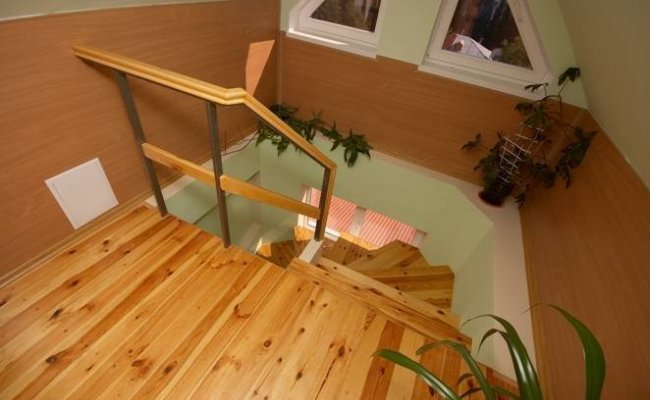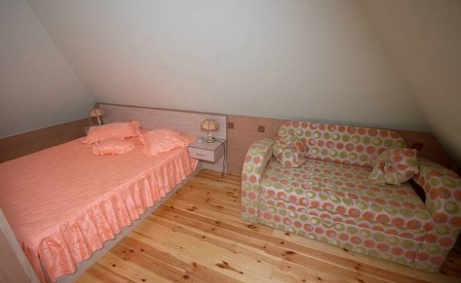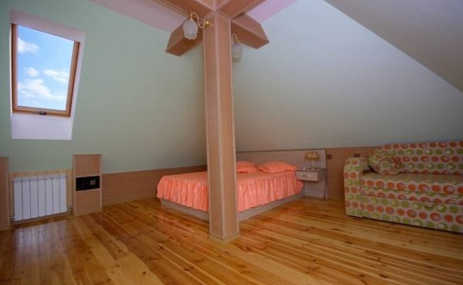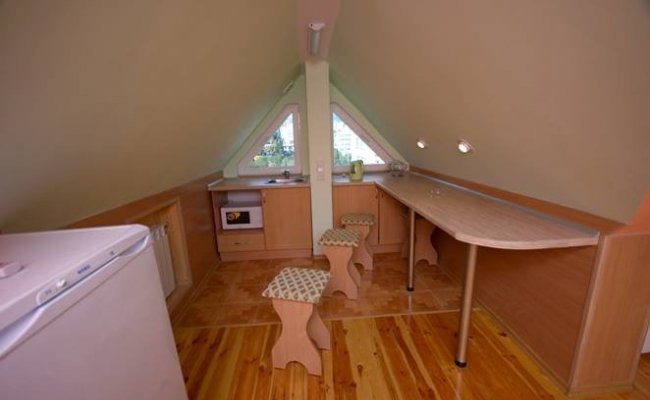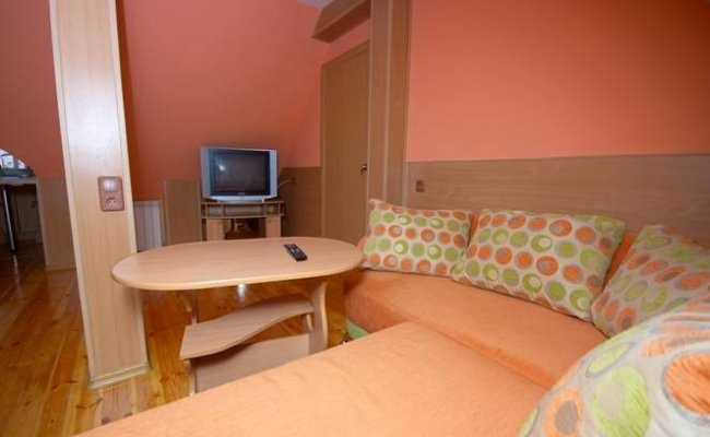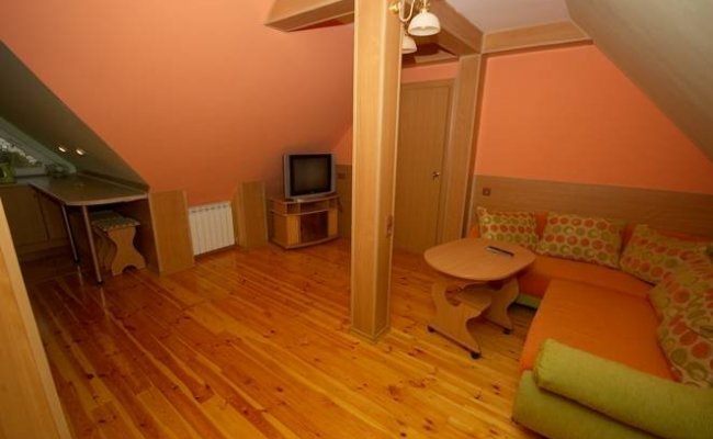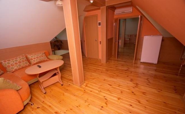 Описание номера "Апартаменты" Двухкомнатный номер, находящийся под крышей дома. В номер ведет деревянная лестница, полы в номере тоже деревянные. В номере два кондиционера (в спальне и в гостиной). Мини-кухня снабжена микроволновой печью, холодильником, электрочайником, необходимым набором посуды.