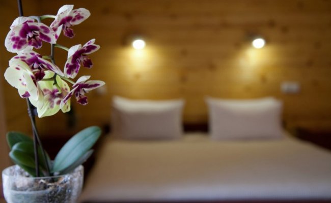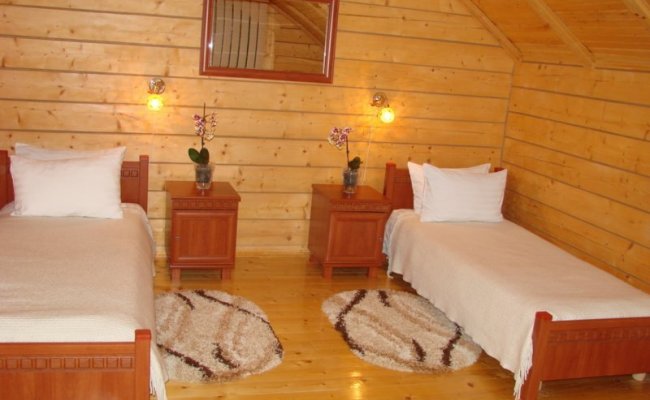 - Номер «стандарт» Двухуровневый - двухкомнатный номер площадью 46 кв.м, два санузла (совмещены с душевыми кабинами), двуспальная кровать и две одноместные кровати, телевизор с кабельным телевидением, стол, два кресла, тумба, шкаф, дополнительные бытовые приборы. Максимальная вместимость 2 +3