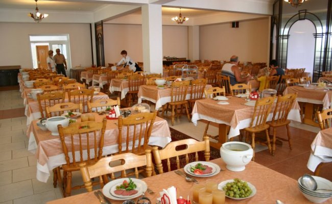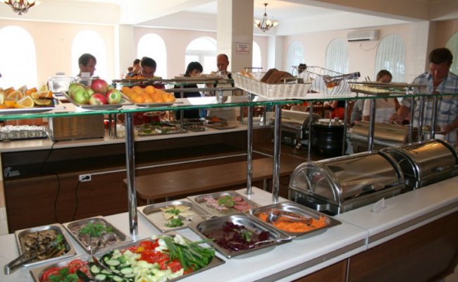 В кафе, завтрак - шведский стол, ужин - заказное меню. Зал кондиционирован.