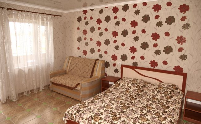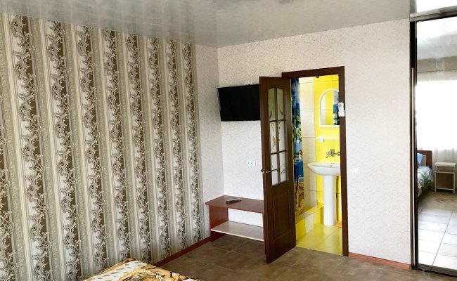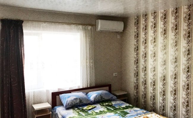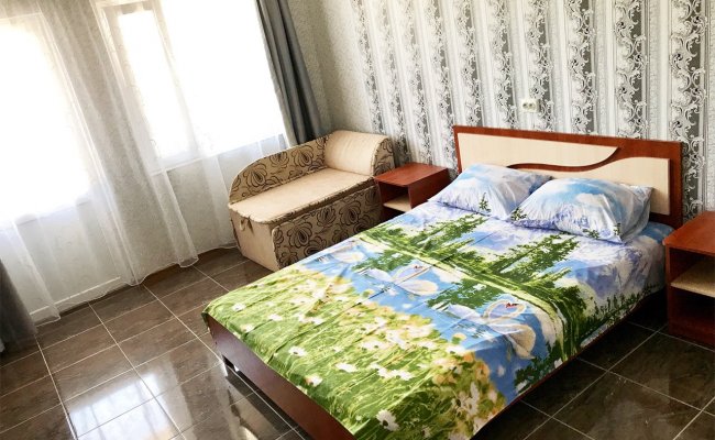 В номере двухспальная кровать и односпальная, холодильник, кондиционер, санузел. Расположен на втором этаже (без балкона).