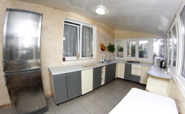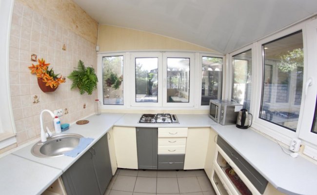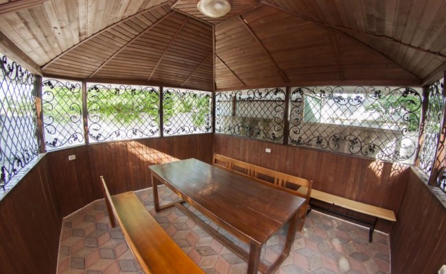 - Веранда. Кухня со всем необходимым для приготовления пищи, газовая плита, электрочайник, набор посуды. Большой металлический стол с двумя лавками и переносной мангал.