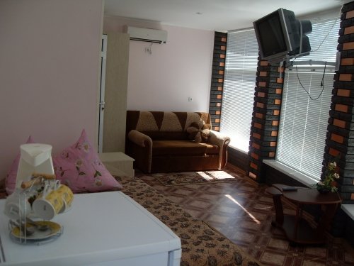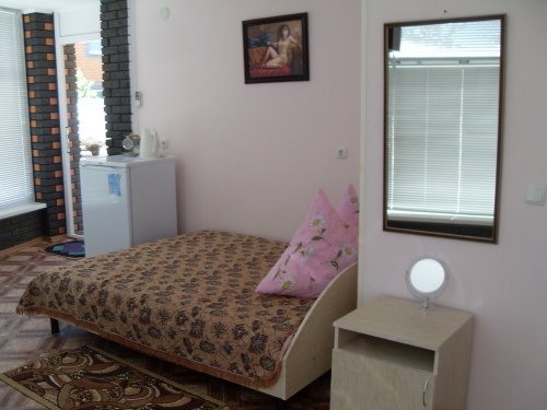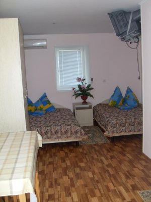 Также есть два ОВАЛЬНЫХ номера в которых есть: стол, стулья, чайный сервиз, электрочайник, холодильник, телевизор (спутниковое ТВ – 10 интересных каналов). Санузел полной комплектации. Горячая и холодная вода круглосуточно (бойлер). Есть также летний душ.