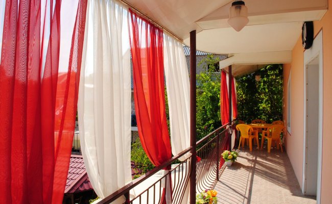 Уютный холл пансионата "Вилла Александра" (Железный Порт), спутниковое TV, роскошная терраса с живой зелёной изгородью, просторные балконы с подсветкой, оригинальные цветочные клумбы.
