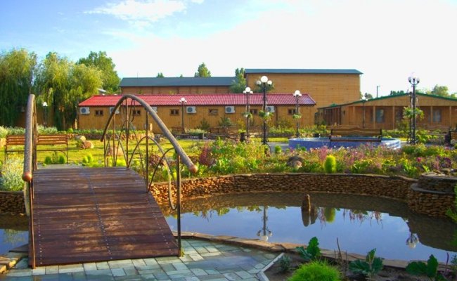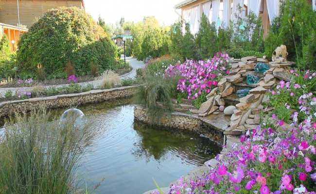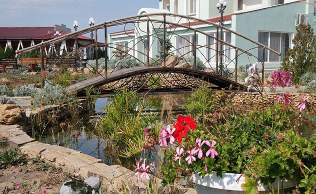 На территории комплекс "Эдем" в Затоке, цветущей весь курортный сезон, - беседки, декоративные фонтаны и водоёмы, площадки для отдыха с печью "барбекю".