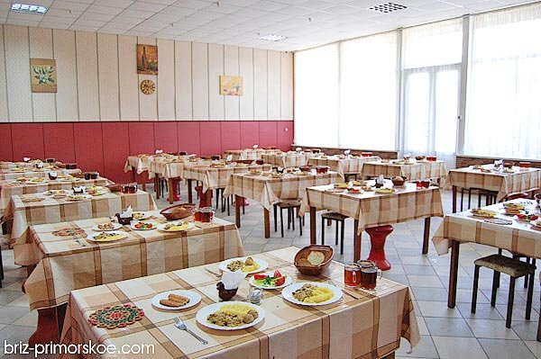 База отдыха "Бриз" в с. Приморское предлагает отдыхающим трехразовое питание с разнообразным меню. Столовая новая, светлая, построенная в 2010 году. В рационе используются свежие овощи, фрукты, мясо, рыба. Наша домашняя кухня не оставит равнодушным никого!